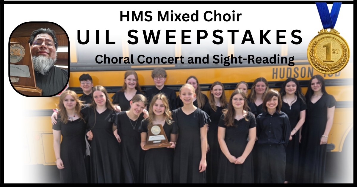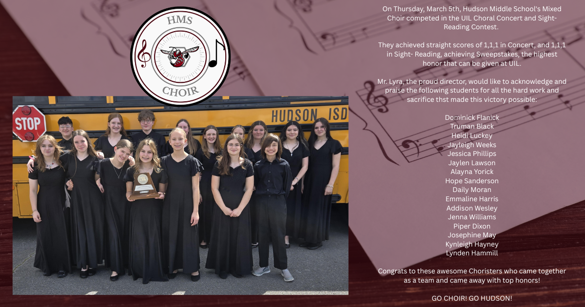 On Thursday, March 5th, Hudson Middle School's Mixed Choir competed in the UIL Choral Concert and Sight-Reading Contest. They achieved straight scores of 1,1,1 in Concert, and 1,1,1 in Sight- Readi...